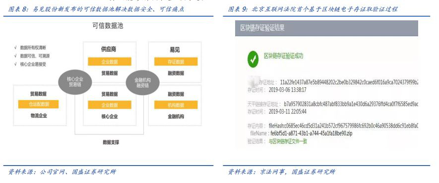 信标链实现业务数据和监管分离的特性上,在供应链金融中有典型的应用需求。这种对监管与业务数据分离的需求是非常普遍的,毕竟任何企业或个体都不愿意自己的隐私数据完全透明地暴露给其他节点。这类痛点在供应链金融中尤其突出——企业的经营数据保密性需求很强,金融机构又担心企业经营数据的真实性,行业提出了类似信标链的解决思路。易见股份推出的可信数据池,类似信标链的思路:企业端采用自己控制下的可信数据池(上链),这是为了企业对自己的隐私数据自主可控,企业外部设有审计链,审计链和可信数据池之间有逻辑映射,为监管和银行提供接口,以证明企业业务数据真实不篡改,同时确保了企业数据隐私。类似的案例还有北京完成的首个利用区块链存证的判决。2019年4月9日北京互联网法院首个采用“天平链”证据的判决出炉,此次案件涉及版权侵权,区块链电子存证作为此次判决的关键证据。电子证据由于易变性、易改无痕等特点,导致涉网案件存证难、取证难、认定难。因此,北京互联网法院于2018年9月9日就建设了首个由互联网法院主导建立、产业各方积极参与的电子证据开放生态平台——天平链,以解决电子证据存证难、取证难、认定难的问题。而天平链并不直接记录版权、证据信息本身,而是记录哈希值。当然,这些简单的场景中只需要哈希运算就能够解决相当的问题。
