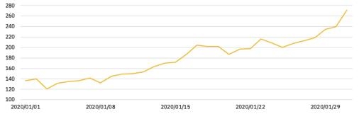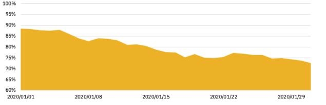 12 月是失落的季节,因为圣诞老人并没有乘雪橇出现。但「一月效应」弥补了这种失落,BTC 从月初的 7,200 美元飙升至月末的 9,500 美元。BTC 市值占比从 69% 降至 66%,体现了 Altcoin 市场的紧俏。这让许多人开始期待 Altcoin 黄金期,或至少是小黄金期的到来,数个月以来首次给了交易者以希望。
