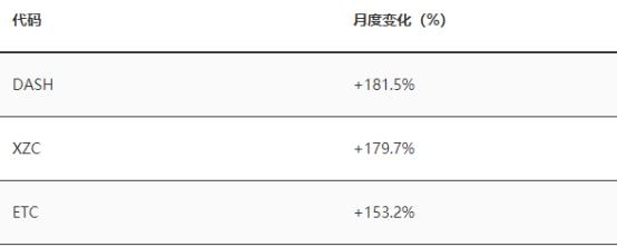 一月份,数字资产价格普遍上涨,其总市值从 1930 亿美元增长到 2550 亿美元,占据市场主导地位的 BTC 市值占比则保持在 65-66% 之间。其中,Altcoin 市值从 610 亿美元上升至 860 亿美元,增长超过 40%。就具体币种来说,DASH 和 ZCoin (XZC) 两种中等市值数字资产表现突出,价格分别上涨 181.5 和 179.7%,是「一月效应」的最好体现。