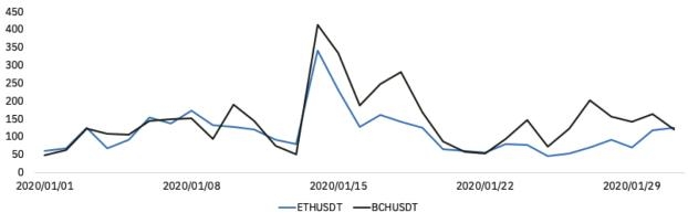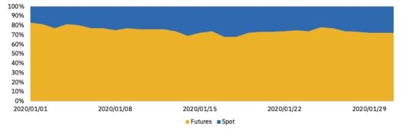 图 8 – 2020 年 1 月合约交易量 vs 现货交易量明细
