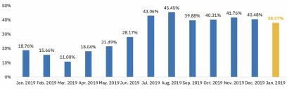 占据市场主导地位的 BTC 交易量在一月跌破 40%(38.17%)大关,与去年十二月相比下跌了 2.31%,这是一个标志性的现象。同时,BTC 的市场份额从 68% 下降到 65%。