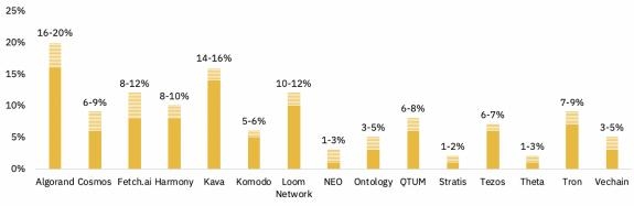如我们此前报告所述,持仓返利(Staking)市场对于数字资产用户非常重要,并且能为长期持有者带来额外收益。币安持仓返利平台 为币安平台的许多数字资产提供被动收益。不同资产的持仓返利预期收益率差异很大,从 1%(NEO)到 20%(ALGO)不等。收益率随着时间的变化也不是一成不变的,详情请查阅具体产品页面列表。