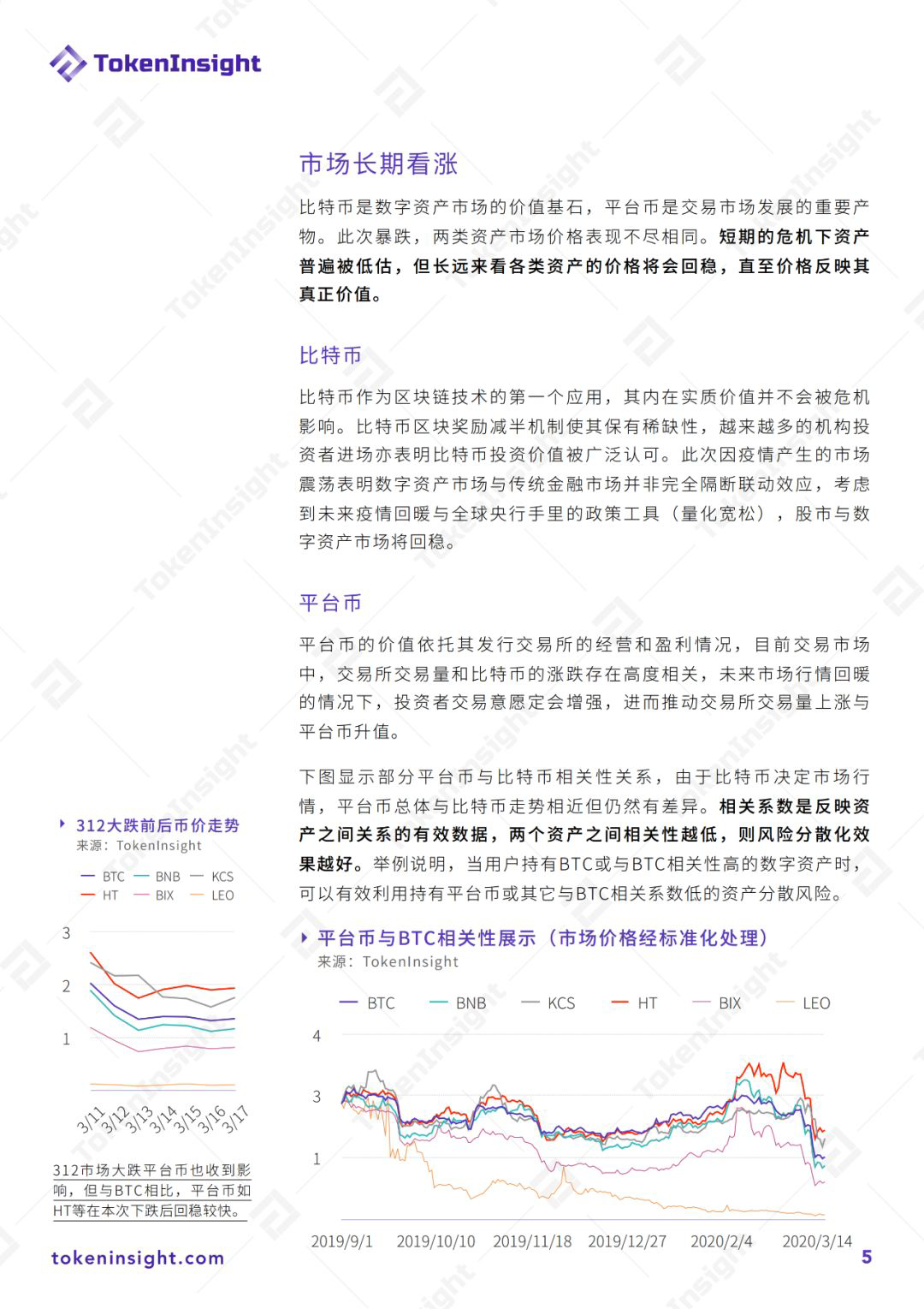 研报 | 极端行情下,应如何投资加密资产? 巴比特 2020年03月26日 11:25 微信扫一扫分享到朋友或朋友圈 编者注:原标题为《极端行情如何投资 | TokenInsight》要点总结:新冠疫情爆发,世界各国实体经济大受影响,全球股市近日陷入剧烈震荡。此次经济危机与金融危机双重压力下,数字资产市场亦未幸免。极端行情下,各类资产和交易所之间受影响程度不同。此时投资者必须选择具有投资价值的高质量资产,避免空气币;克服投机心理,采用低风险投资策略;选择拥有足够高资产沉淀能力和合理风控制度的交易所,才能平稳度过极端行情,保护自己的权益。