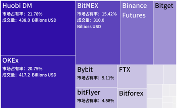 2020年第一季度数字资产合约主要交易所成交量如下图所示,总规模达$21,048亿。其中,行业前三(以成交量计),即Huobi DM(第一)、OKEx(第二)和BitMEX(第三)占市场份额约56%。