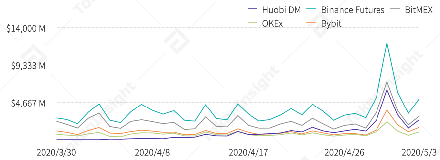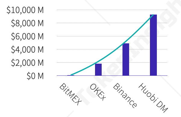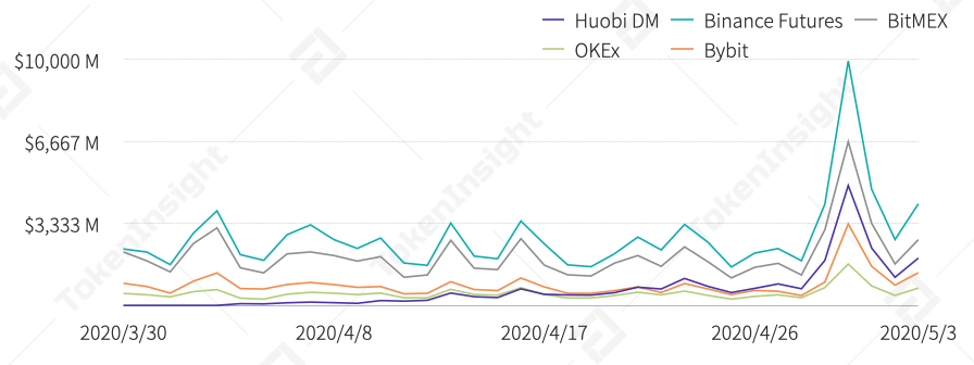 2020Q2起主要合约交易所BTC永续合约成交量来源:TokenInsight