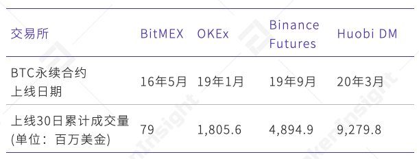 各主要交易所BTC永续合约上线前30日累计成交量对比,来源:TokenInsight