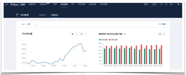 如表所示,各主要交易所基础信息高度同质化,下阶段用户体验竞争或将集中于深度行情展示方面;具体而言,资金流向、板块动态等需要对交易数据进行二次加工的信息会吸引更多用户。在此方面,一些交易所每日发送《行情日报》,Huobi DM和OKEx等则上线了合约大数据交易所进行实时展示,投资者可通过此类产品对市场风向进行判断。