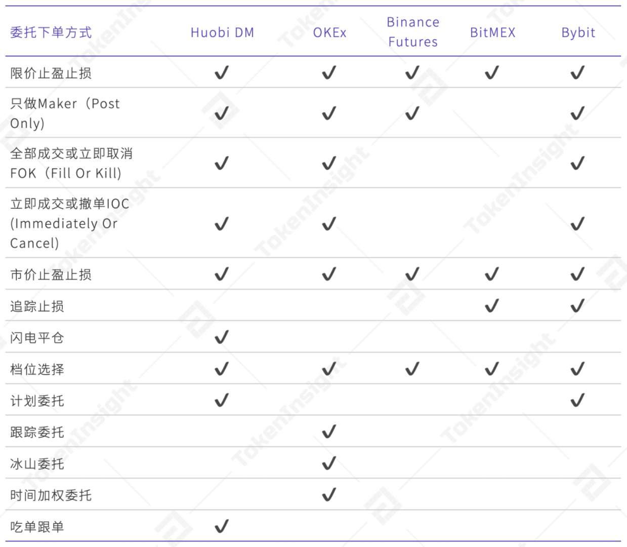 主要交易所永续合约委托下单方式,来源:TokenInsight