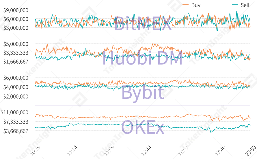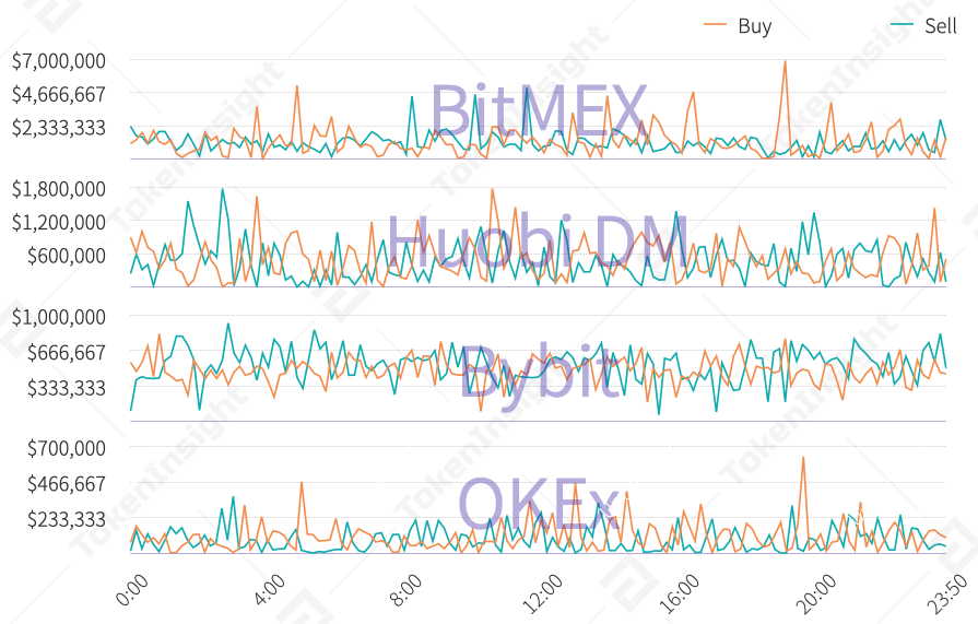 如图所示,各主要交易所盘口深度双向可长期维持于300万美金以上,能够满足一般用户的交易需求。但稳定性方面BitMEX数据于300万至600万美金间大幅波动,Huobi DM、Bybit和OKEx则相对稳定,盘口表现更优。