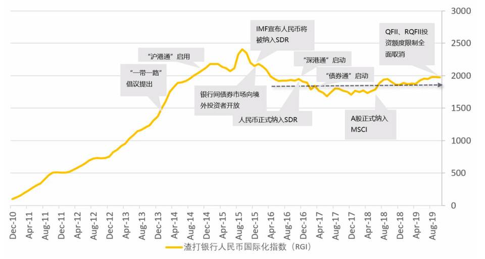 图 2:2019 年 4 季度全球央行外汇储备按币种分布,数据来源:币安研究院、IMF趋势上看,自 2015 年「811」汇改后,人民币的国际化进程遭遇了较大阻力。在此我们采用渣打银 行人民币全球化指数 (RGI) 和人民币国际支付总量两个数据来观察人民币在海外的市场状况。 RGI 指数主要基于香港、伦敦、新加坡、纽约等离岸人民币市场的四个成分调查计算而来,包括 存款量、贸易结算和其它国际支付、「点心债」和存款证发行 (CD),以及外汇交易量。