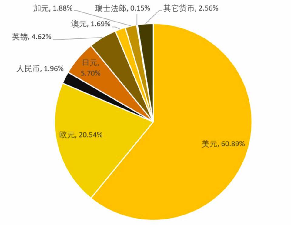 - 此外作为跨境交易结算的主导货币,全球 88% 的外汇交易使用美元,并且除美国外的其他 国家进口货物的40%以美元计价。国际债券发行的62%、全球所有债权发行的 49%以及所 有跨境银行债权的48%以美元计价 20。