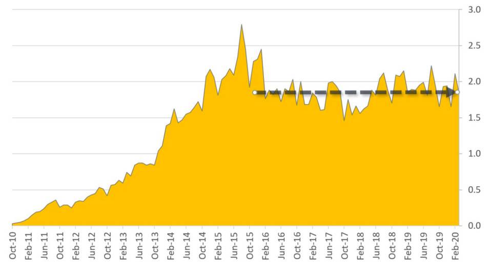 图 1-3 显示了尽管过去几年里中国经济和国际贸易量继续以较高的速度增长,且人民币市场有着众 多开放举措,但在海外事实上人民币国际化进程在 2015 年后遭遇了较大的阻力。这可能由于 2015 年中国当局对国内资本市场的干预,以及人民币兑美元的大幅贬值,无论是有心或无意,都向全 球市场发出了一个信号,而这个信号被普遍做了负面解读 7,加之近年来中美贸易摩擦升温,美国 在金融和贸易政策上对中国频频发难,显示人民币国际化在坚持原有路线的基础上或亟需开辟新 的途径。