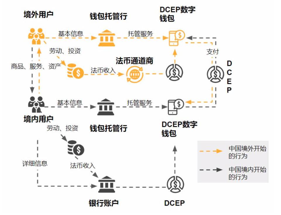 - 海外法币通道在 DCEP 海外流转中起着不可或缺的作用。否则即便境外用户拥有 DCEP 钱包但因没有中国的银行账户,只能通过向中国境内用户出售商品、服务或资产来获取 DCEP,之后才能在境外流通或购买中国的商品、服务、资产,这将导致一个结果——中 国的国际收支在 DCEP 项下将长期维持赤字状态。