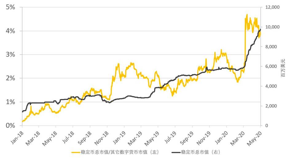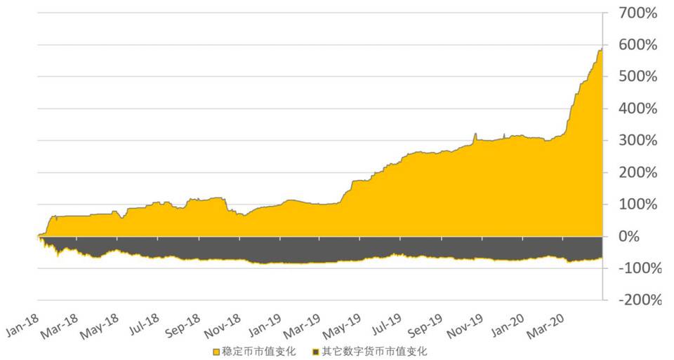 图 8: 稳定币和其它数字货币市值 2018-2020 变化,数据来源:币安区块链研究院,coinmarketcap