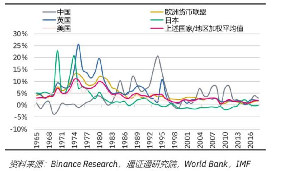 图 4: 以 2015 SDR 货币权重为参照,按 GDP 平减指数衡量的年通货膨胀率在币安研究院和通证通联合撰写的研究报告中 10,我们使用按 GDP 平减指数衡量的年通货膨胀率 作为货币购买力是否稳定的参照坐标。由于 GDP 平减指数基于某一固定年份的物价评价后续的物 品与劳务总量的价格变化,所以基于得到的通胀率能更好的反映出真实的货币购买力上升 / 下降情 况。