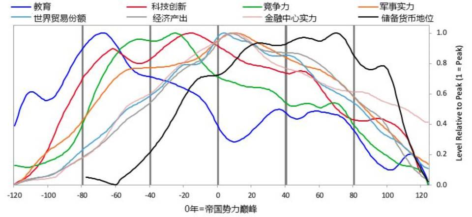 桥水基金创始人达里奥在今年的新书《正在改变的世界秩序》中对过去数百年间 11 个主要国家 / 地 区的历史数据进行了量化分析,发现一个强势国家 / 地区通常维持 250 年 (±150 年),其中教育、 科技和竞争力等往往领先崛起; 随后军事、贸易、产出等指标开始上升,金融中心也随之诞生; 而最后形成的才是储备货币地位 (下图黑线)。不止是储备货币地位的得,其地位的下降亦与其 他基本面相比存在显著滞后,所以储备货币地位的下降也往往预示着一个国家 / 地区走向衰退。