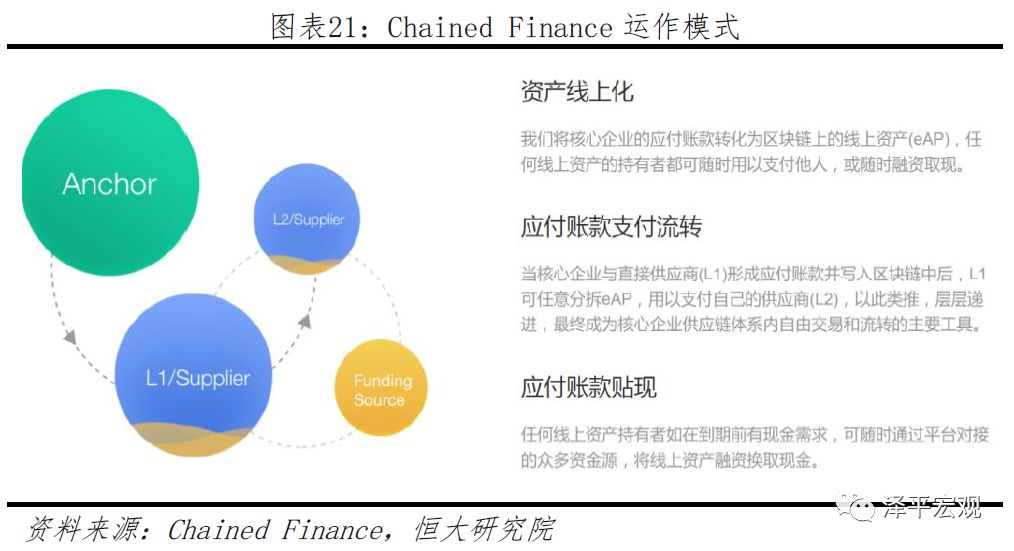 2017年3月,互联网金融平台点融网和富士康集团旗下金融平台富金通合作推出区块链金融平台“Chained Finance”。Chained Finance首先将核心企业的应付账款转化为区块链上的线上资产eAP,eAP可以在各级供应商之间流通(用于支付或用于融资取现)。当核心企业与一级供应商L1形成应付账款并写入区块链后,L1可以任意分拆eAP并用于支付自己的供应商L2,以此类推至L3、L4等,最终eAP成为区块链平台上的“商票银票”。而线上资产eAP通过密码学加密具有不可篡改、不可被重复支付的特性,这将有助于增进供应链上下游之间的互信;区块链的可追溯性也保证了所有交易和流通过程的透明可见。