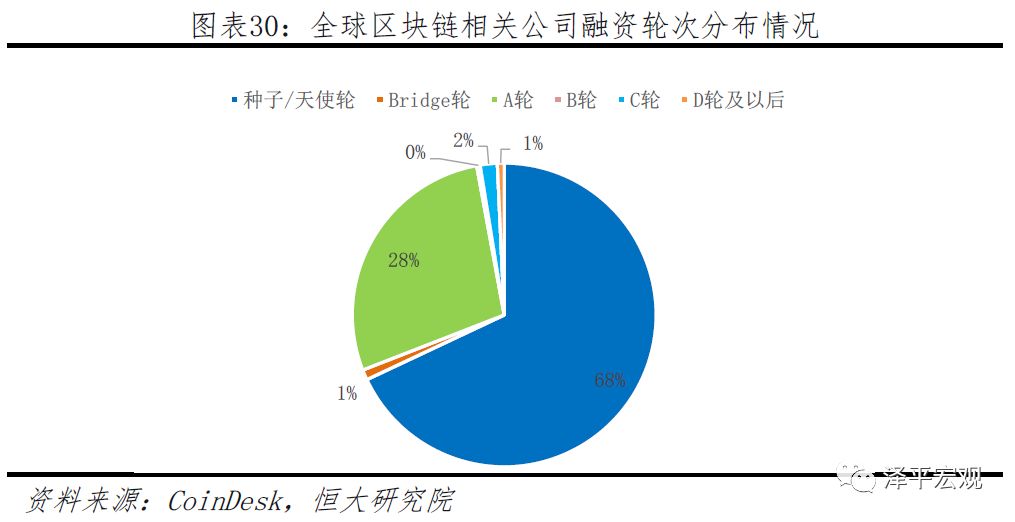 从全球区块链相关公司融资轮次分布情况来看,目前超95%以上融资事件处于种子轮、天使轮及A轮阶段,B轮及以后只占3%,这说明产业依旧处于早期阶段。2014年后VC融资轮投数量逐步减少,平均轮投规模逐渐增加,投资者更多地将目光从数字货币转移到具体应用场景的落地,说明投资者更加理性、产业逐渐进入早期阶段的尾声。