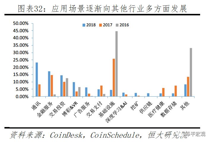 虽然金融行业依旧是发展重点,但其他行业也快速发展,逐渐从“1到N”。据CoinDesk和CoinSchedule投融资数据统计显示,截止到2018年3月,全球区块链在金融行业投资占比(包括VC和ICO)为17.2%,较2017年上升2.6个百分点,排为第二,通讯行业超越金融行业跃至第一。较明显增长的还有博彩&VR、交易投资、广告服务、供应链和深度学习等行业。数据说明在金融行业取得经验后,行业开始考虑与其他应用场景结合的可能性。