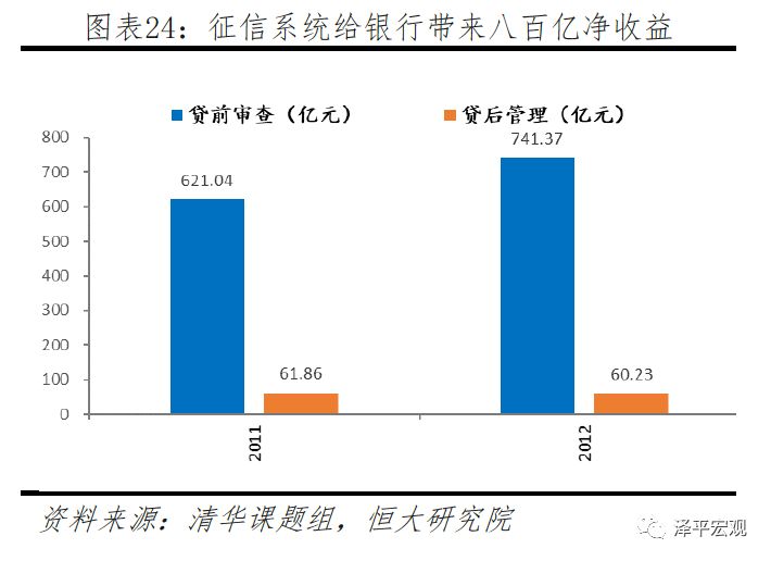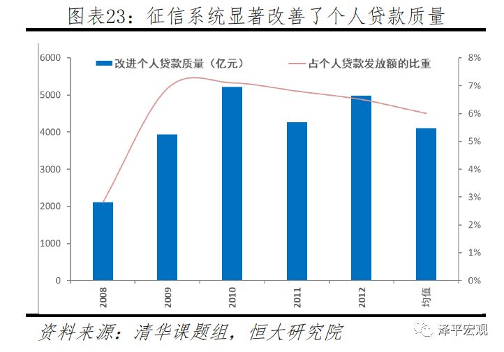 征信是依法收集、加工自然人及其他组织的信用信息,并对外提供信用报告、信用评估、信用信息咨询等服务。征信系统的建设对信用风险的防范和信用交易的扩大有着重要作用,从而提高整个经济的运行效率。早在2014年,清华课题组发布的报告中就曾测算,2012年征信系统改善了4986亿元的消费贷款质量,为银行带来801.6亿元的收益,拉动了约0.33%的GDP增长。