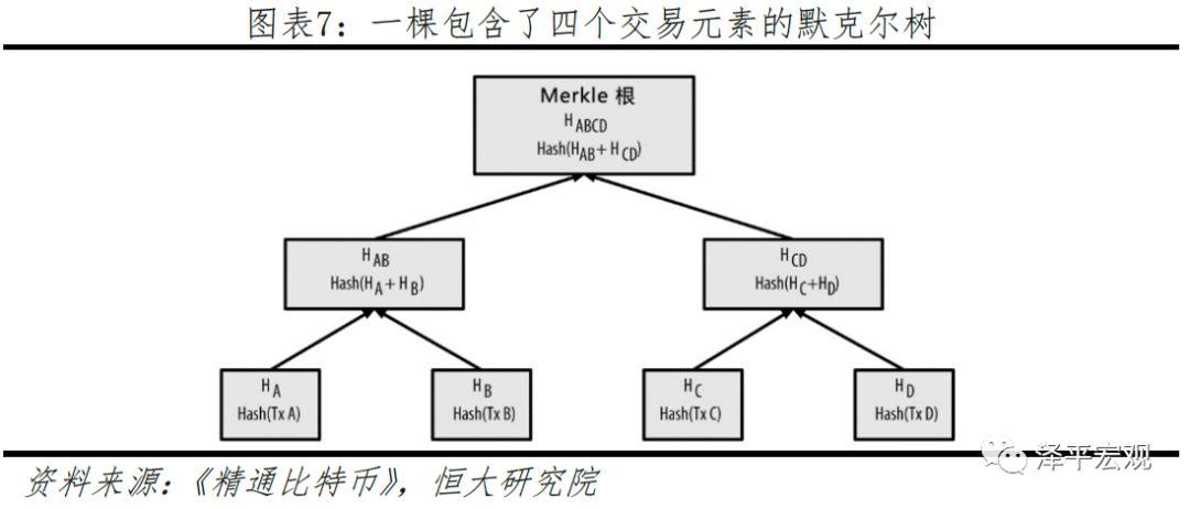 默克尔树(Merkle Tree)实际上是一种数据结构。这种树状数据结构在快速归纳和检验大规模数据完整性方面效率很高。在比特币网络中,默克尔树被用来归纳一个区块中的所有交易,其树根就是整个交易集合的哈希值,最底层的叶子节点是数据块的哈希值,非叶节点是其对应子节点串联字符串的哈希。我们只需要记住根节点哈希,只要树中的任何一个节点被篡改,根节点哈希就不会匹配,从而可以达到校验目的。