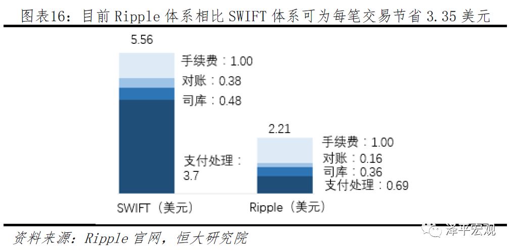 流程的简化大幅降低跨境支付的成本。目前Ripple体系可以降低涉及到代理行和SWIFT所产生的流动性损失、支付费用、换汇费用以及资金运作费用。根据Ripple估算,银行间每笔交易的成本将从5.56美元下降到2.21美元,降低60%,以2016年通过SWIFT完成的30多亿次支付类报文数量计算,2016年可以节约大约100亿美元的费用。
