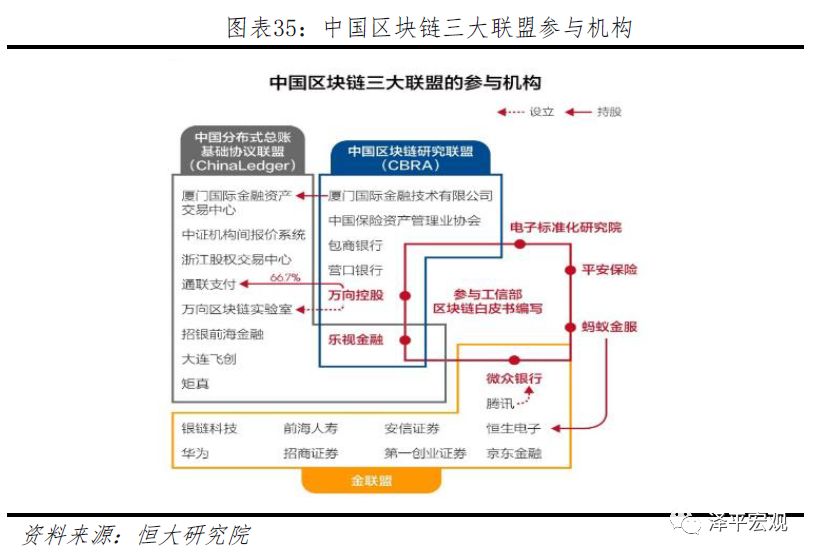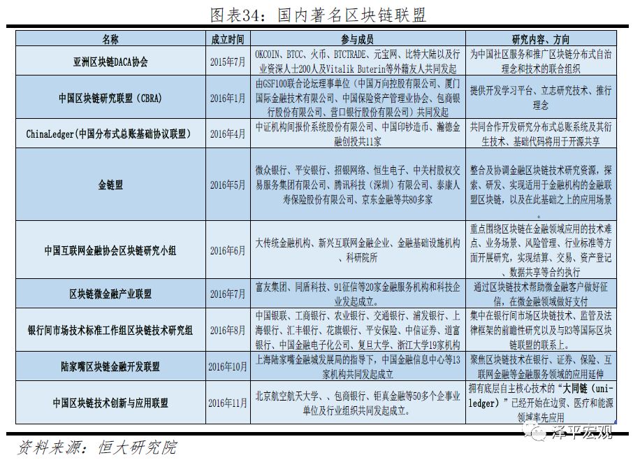 中国联盟:据中国区块链应用研究中心发布的《中国区块链行业发展报告2018》显示,2015年至2017年,国际间成立的区块链相关联盟、论坛近200个,中国方面有ChinaLedger(中国分布式总账基础协议联盟)、金链盟、CBRA(中国区块链研究联盟)等近20个联盟。