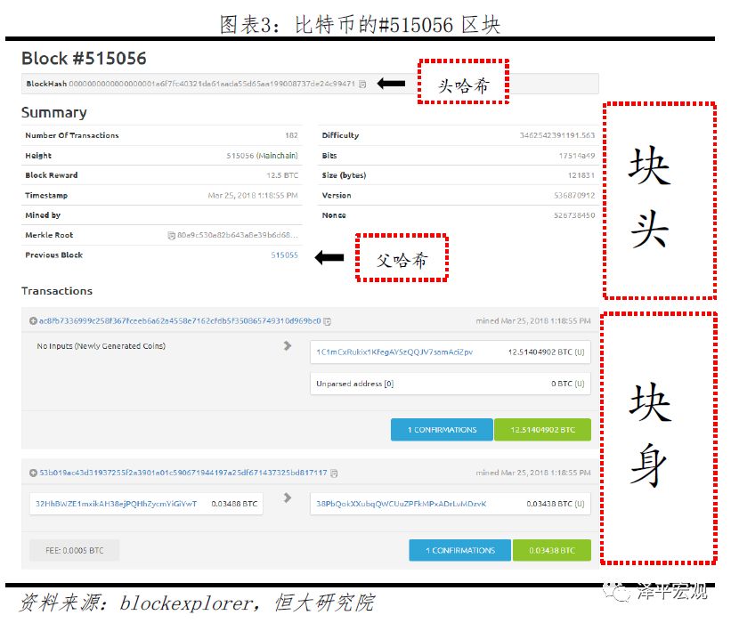 以上图的比特币#515056区块为例,其块头中除了包含头哈希、父哈希及默克尔根以外,还包含了以下重要信息: