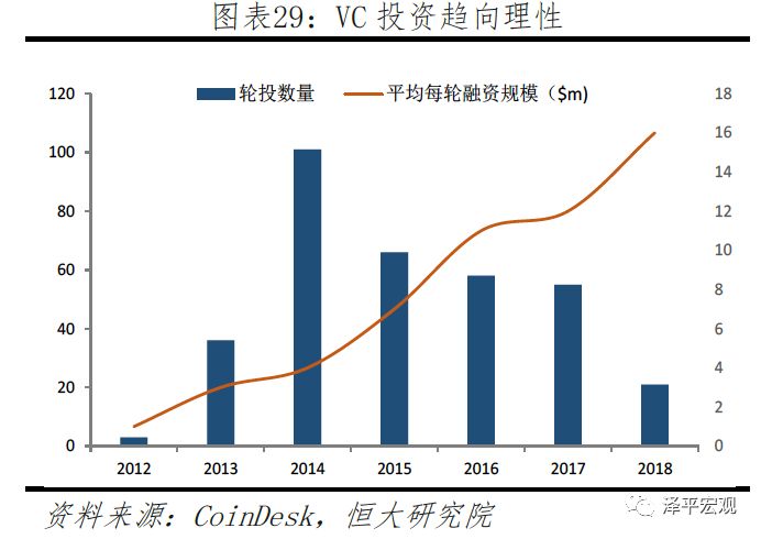 从全球区块链相关公司融资轮次分布情况来看,超95%以上融资事件处于种子轮、天使轮及A轮阶段,B轮及以后只占3%,这说明目前产业依旧处于早期阶段。而2014年后VC融资轮投数量逐步减少,平均轮投规模逐渐增加,说明产业已经逐渐进入早期阶段的尾声。