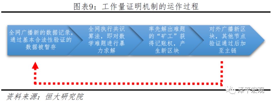 比特币区块链就是通过足够大的工作量来求解数学难题来就“谁有权记账”达成共识。“矿工”在挖矿过程中会得到两种类型的奖励:创建新区块的新币奖励,以及区块中所包含交易的交易费用(交易双方为了交易被区块链尽早记录会提供给矿工一笔交易费用作为激励)。这种算法的竞争机制以及获胜者有权在区块链上进行交易记录的机制实际上分别解决了分布式记账以及记账权归属的问题。在比特币区块链中,这一过程还起到了货币发行的作用——目前每隔10分钟,就会有挖到新区块的矿工收到12.5个比特币的奖励。