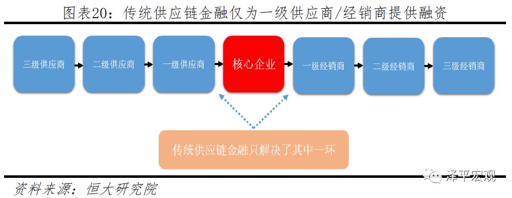 首先,当前模式下,银行主要依赖供应链核心企业的控货和销售能力,而由于其他环节的信息不够透明,银行出于风控考虑往往仅愿意对上游供应商(一级供应商)提供应收账款保理业务,或对其下游经销商(一级经销商)提供预付款或存货融资。这导致了二三级等供应商和经销商的巨大融资需求无法得到满足,不仅使得供应链金融的整体市场受限,更可能使得供应链上的中小企业因为融资受限影响生产进度和产品质量,从而伤害整个供应链。