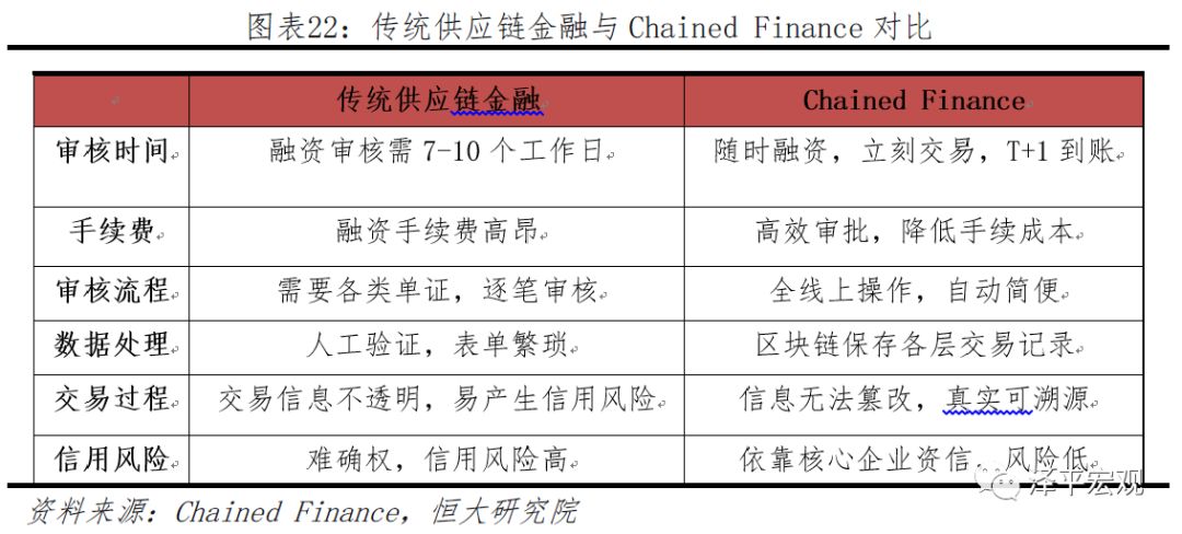 Chained Finance目前为私有链模式,为富士康的核心企业提供相关融资服务,已经覆盖供应商150家、金额已达5亿人民币,并且最深层服务至第五级供应商,未来还会进一步拓展到汽车业和服装业。对于供应链上的中小企业而言,传统模式下融资成本高达25%以上,而在Chained Finance平台下可以核心企业资信的应收账款融资,融资成本可以降低至10%以下。