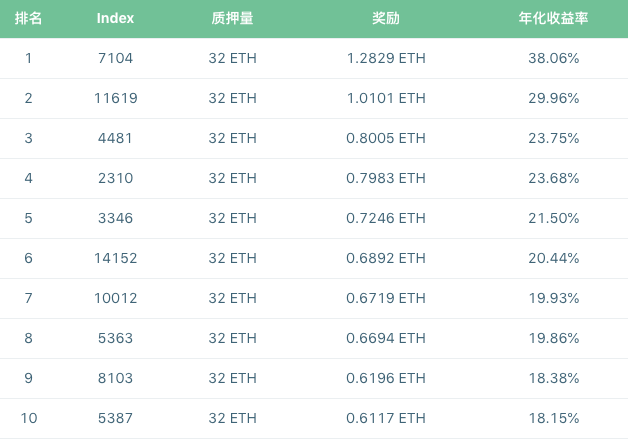 根据以太坊浏览器 Etherscan 信标链的测试网数据,可以看到 Staking 收益率排名第一的验证人年化收益率可以高达 38.06%,而排名第十的验证人年化收益率为 18.15%,差额将近一倍。