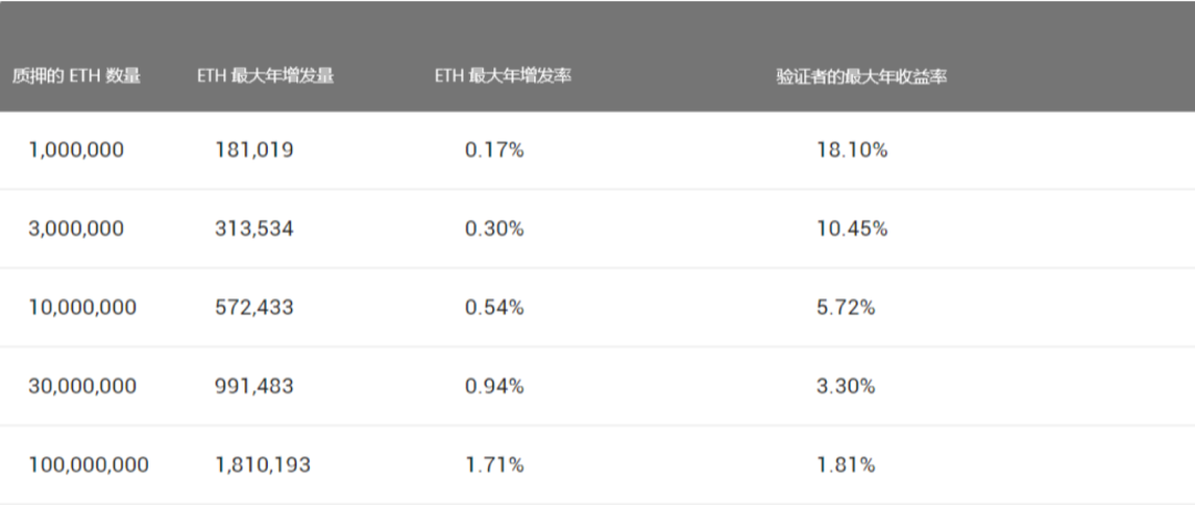 下图是当前被提议的 ETH 最大年增发率和验证者的最大年收益率 (后期可能会有所改变):