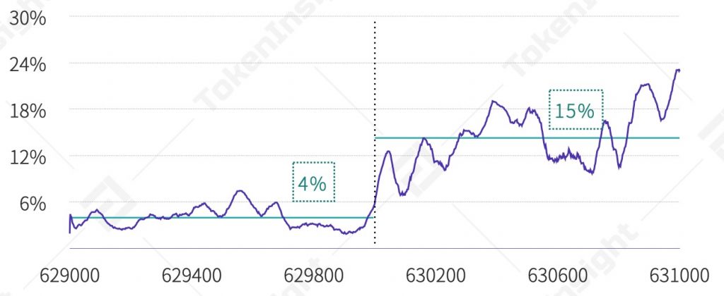 而下图从减半前后2000个区块的手续费占比可以看出:减半后矿工挖矿收入减少,但交易手续费收入在减半瞬间增加了200%。随着减半后比特币网络的稳定运行,矿工的平均交易手续费占比从减半前的4%涨至15%左右。