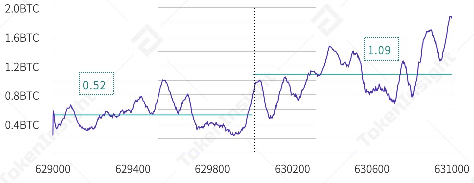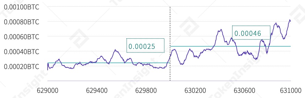 从图中可以看出:减半前后,区块高度在减半前后50个区块内,比特币交易手续费已经出现明显上涨。区块高度630,050附近,总交易手续费下降到低点,但随后仍保持上升趋势。