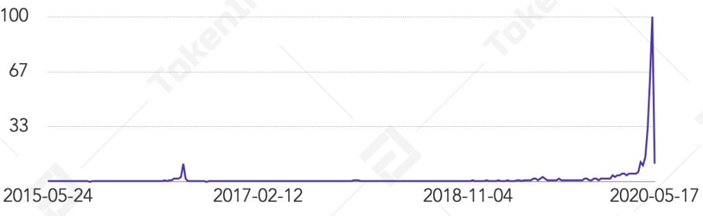 3. 减半热度激增 根据谷歌趋势数据,目前比特币减半(Bitcoin Halving)的搜索量在减半一周内达到了峰值100,搜索量超此前峰值(2016年7月3日—6日,比特币第二次减半前)逾9倍;