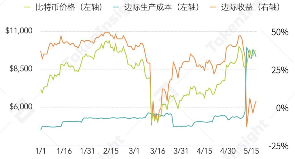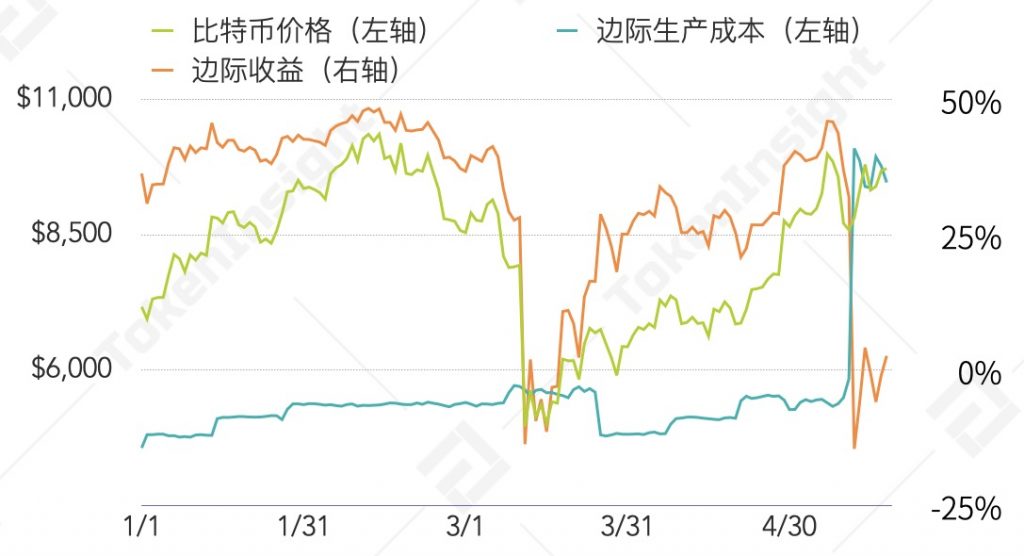 矿工边际生产成本在减半前为5,300美元,减半后升至9,300美元左右。