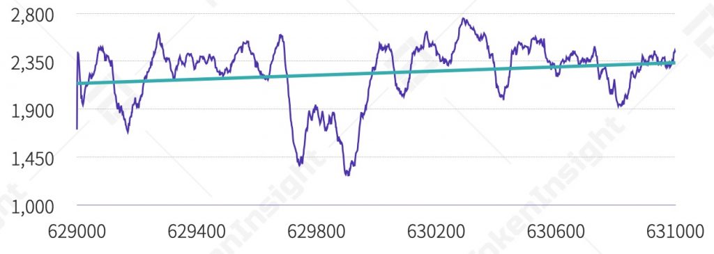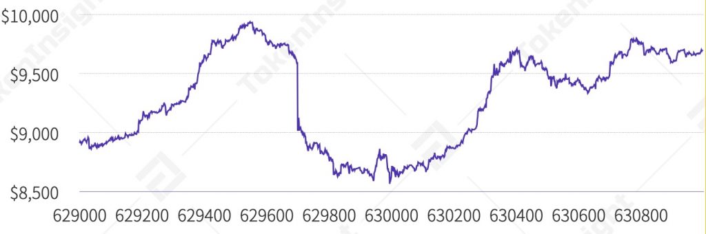 从下图可以看出, 在比特币完成减半前后2000个区块内,其价格波动剧烈,在区块高度629,950附近达到峰值,但随后出现大幅下降。正式减半后,比特币价格缓慢上涨,完全收复前期跌势,并试图再度冲击10,000美元关口。3.2.1 比特币价格