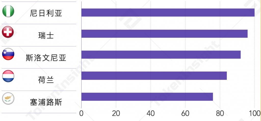 另一方面,截至5月30日,近30天的谷歌趋势显示:非洲和欧洲是本次对比特币减半最为热情的地区。在近30日的热度搜索Top5地区中,尼日利亚的搜索热度最高,其次是瑞士和斯洛文尼亚。3.1.2 比特币减半国家/地区搜索热度