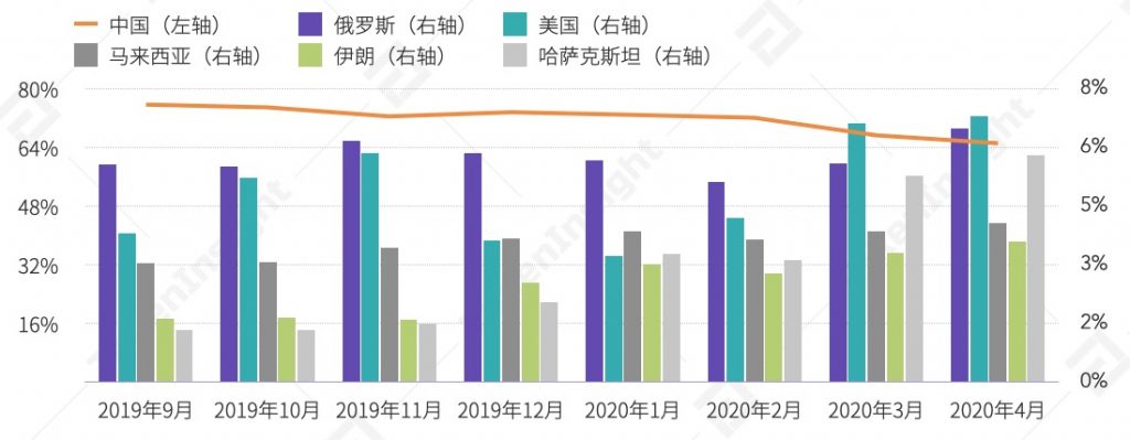 截至2020年4月,当前美国是哈希率占比第二高的国家,占比7.24%;排在第三位的俄罗斯占6.9%;哈萨克斯坦、马来西亚和伊朗分别占据了6.17%、4.33%和3.82%的全球市场。