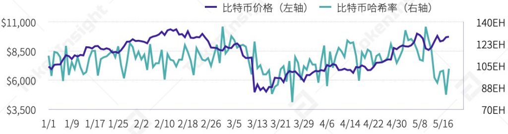 尽管价格基本与3月持平,但在减半行情下,比特币出块时间明显受到较大影响。同时也印证了减半后全网算力的变化。TokenInsight认为,目前并不能直接观察到全网算力,但可以从平均出块时间和难度来计算。根据平均出块时间分析,比特币全网算力在减半后经历了显著下降。