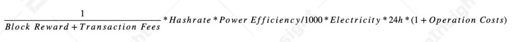 其中 Block Reward 表示每日比特币网络产生的区块奖励(以比特币数量表示,减半前此数值为1800,减半后为900,但根据情况有所变动);Transaction Fees 为每日比特币网络交易手续费;Hashrate 为哈希算力;Power Efficiency 为算力功耗;Electricity 为电价;Operation Costs 为经营成本。此公式展示挖出1个比特币矿机的生产成本。矿工边际收益为比特币价格扣除生产成本后所占生产成本比例。