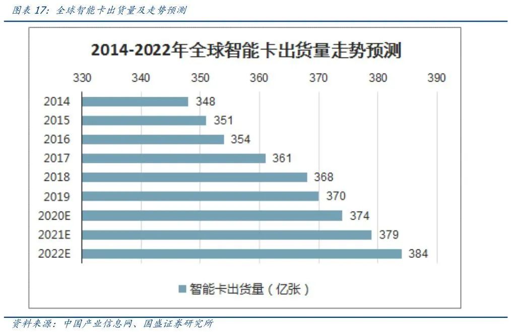 智能卡市场需求依旧强劲,下游各类应用空间广阔。随着智能卡技术的日趋成熟,智能卡的应用领域也更加广泛,不仅是NFC移动支付,在社保、金融、通信、交通、教育、安全证件、医疗健康等多个领域都得到规模化的发展与应用。由于NFC技术的拓展性、便捷性、安全性等优势,智能卡市场需求潜力巨大,下游应用空间广阔。2018年全球智能卡出货量达368亿张,较2017年上涨2%。预计到2022年全球智能卡出货量将达到384亿张。
