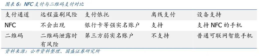 市场低估了NFC SIM卡移动支付的便利性和安全性。市场普遍认可扫码支付作为移动支付的最优方案,忽视了NFC SIM卡方案具有的可离线使用、硬件安全环境等特点,低估了此方案的便利性和安全性。由于NFC支付的使用受距离限制,因此很难出现远程盗刷,而二维码支付存在一定的风险,尤其是支付二维码泄露的风险,相比之下NFC支付更为安全。且NFC密钥一般存在SIM卡这类具有TEE(可信执行环境)的手机硬件中,离线支付需要通过TEE进行签名并且检查没有进行过双重支付,这个时候双离线支付的安全性实际上交给支持TEE芯片的生产商进行担保,因此具有更高的安全性。
