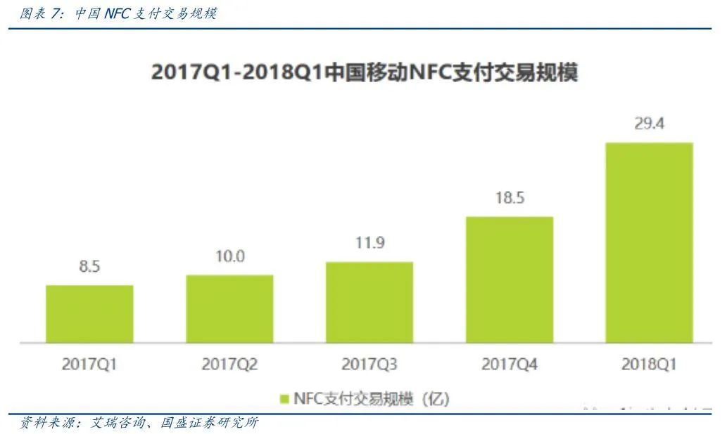 2017年我国移动NFC支付规模达到了48.9亿元,而且从2017Q1-2018Q1的环比增速来看,该市场规模正进入加速增长阶段。2018Q1我国移动NFC支付规模继续保持着加速增长的速度,达到29.4亿元。可见,虽然在支付应用规模上不及二维码支付,但NFC支付依旧拥有一定的市场。
