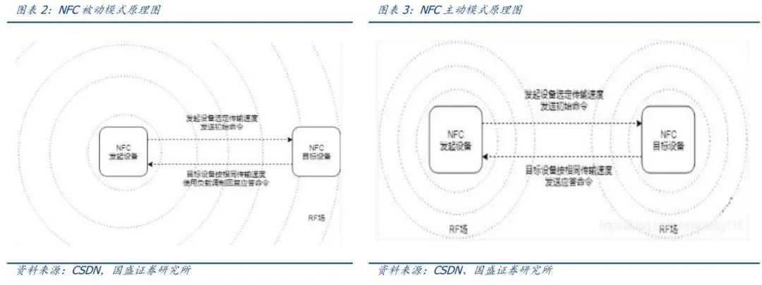NFC 有被动模式和主动模式两种工作模式。被动模式如下图所示,NFC 发起设备( 也称为主设备) 需要供电设备,供电设备为主设备提供能量来提供射频场,并将数据发送到NFC 目标设备( 也称作从设备) ,传输速率有106kbps、212kbps 或424kbps三种选择。从设备可以不需要供电设备,原因是从设备不产生射频场,而是利用主设备产生的射频场转换为电能,为从设备的电路供电,接收主设备发送的数据,并且利用负载调制( loadmodulation) 技术,以相同的速度将从设备数据传回主设备。由于在这种工作模式下射频场不在从设备中产生,而是被动接收主设备产生的射频场,所以被称作被动模式,在此模式下,NFC 主设备可以检测非接触式卡或NFC 目标设备,与之建立连接。主动模式如下图所示,目标设备和发起设备在向对方发送数据时,都需要主动产生射频场,因此称为主动模式,这种模式下供电设备需要功能来提供产生射频场的能量。这种通信模式是对等网络通信的标准模式,连接速率非常快速。