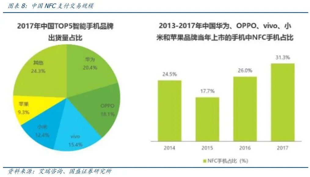 NFC将成中高端智能手机标配并逐渐普及,有利于NFC移动支付的推广。据艾瑞统计,在国内出货量TOP5的智能手机(包括华为、OPPO、vivo、小米和苹果)当中,2014-2017年上市的手机中NFC手机占比得到了明显的增长,其中2015年的占比仅为17.1%,但到2017年则增长到了31.3%。随着成本的逐渐下降,我们认为NFC将成为手机的主流配置。
