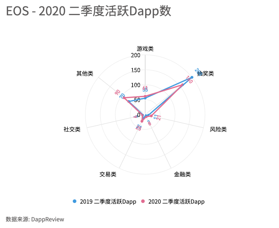 - 抽奖类活跃Dapp 160个,较去年减少了40个,是EOS活跃Dapp数最多的分类。