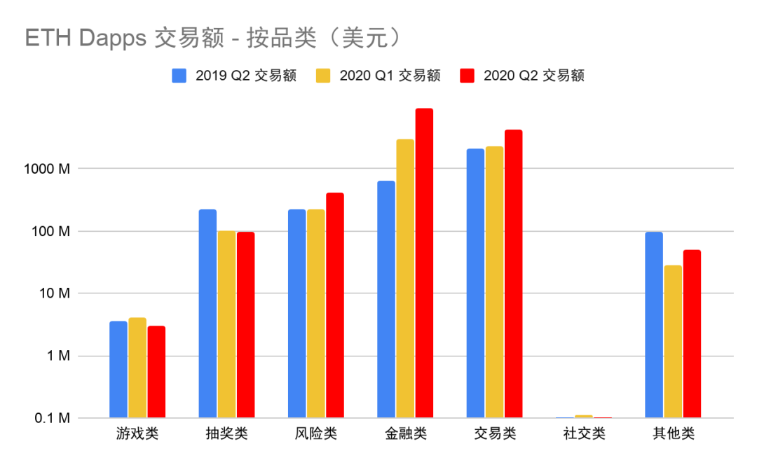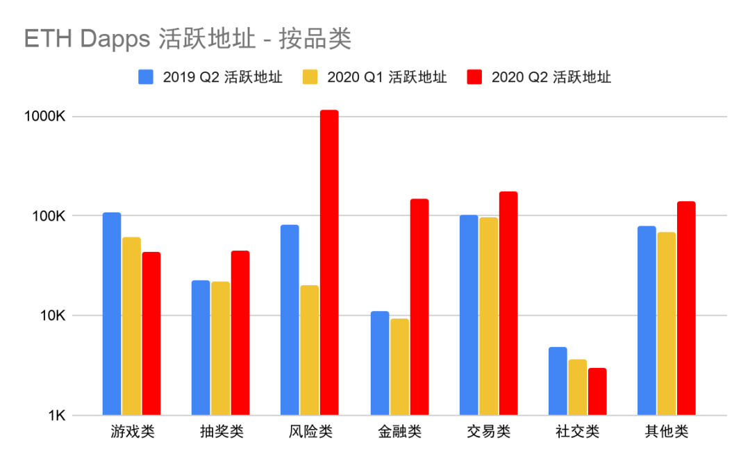 在本文中,我们将借贷类项目(如Maker,Compound,bZx)以及衍生品类项目(如Augur等)归为金融类(Finance),将去中心化交易所(如Kyber、Uniswap、Tokenlon)等归为交易类(Exchange)。这两类项目统称为DeFi类。与2019年同期相比,在2020年第二季度: